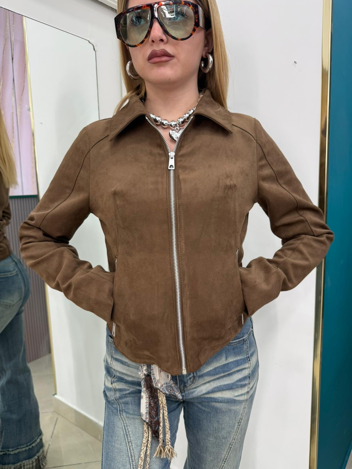 Giubbino in camoscio, marrone, morbido e raffinato, dal fascino elegante e senza tempo.