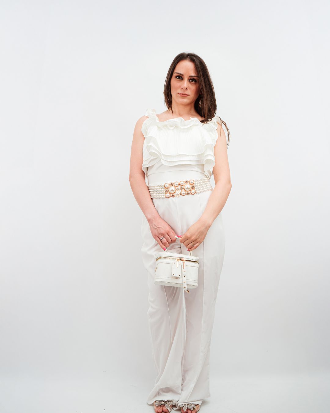 Tuta a palazzo con spalline strette e rouche sul davanti